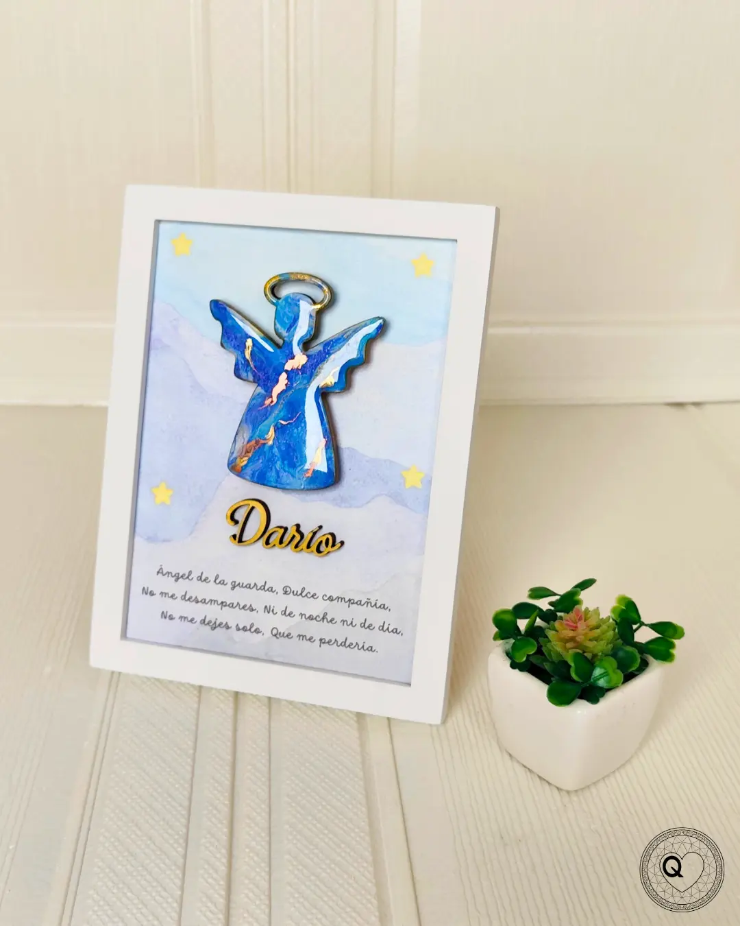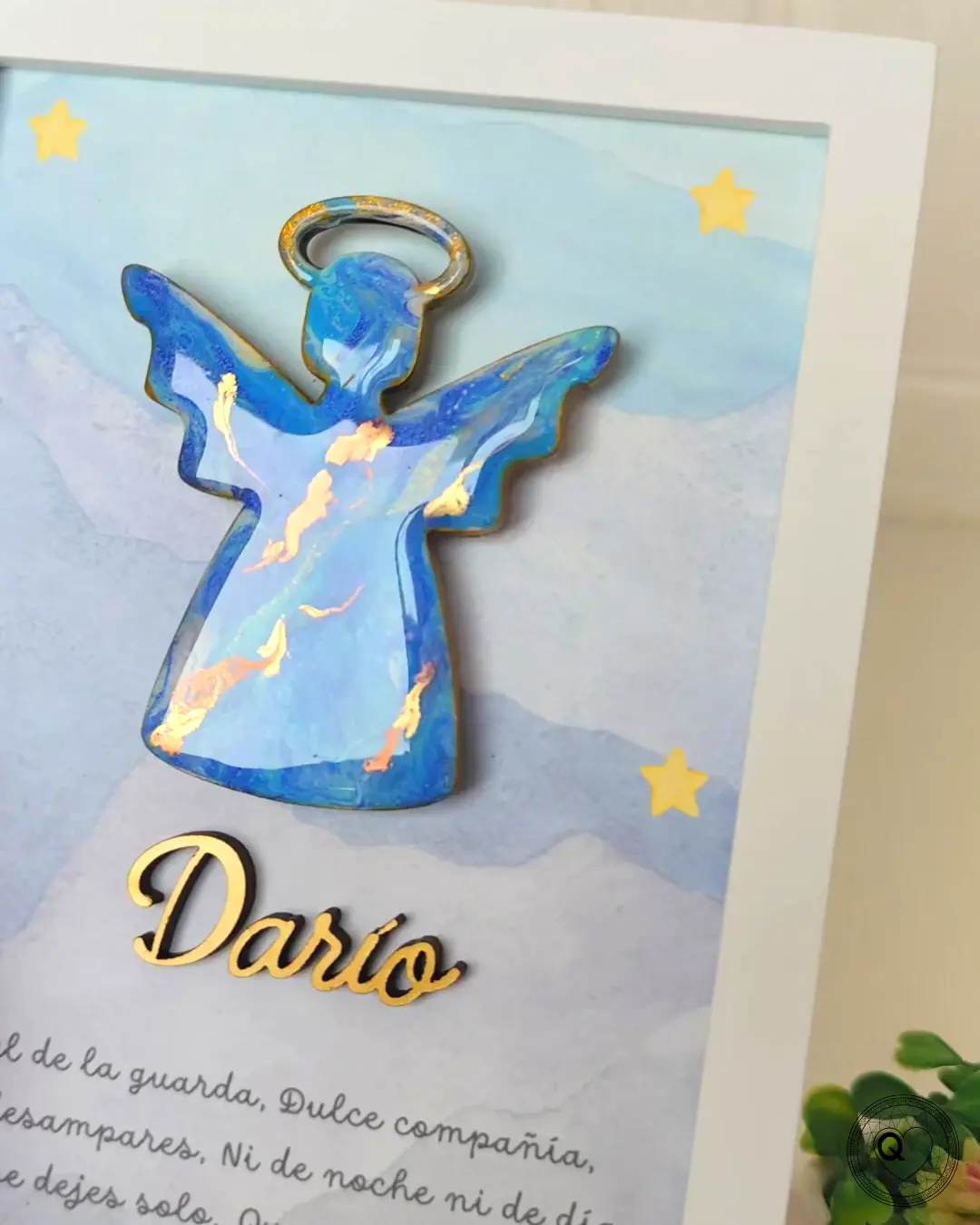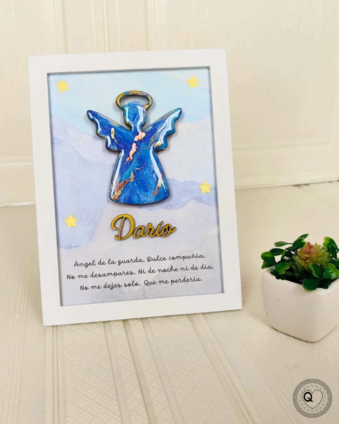 Ángel pintado a mano con el metodo de arte fluido y resina, acompañado de un fondo impreso en estilo acuarela que incluye el nombre personalizado en relieve . Tamaño 15 x 20 cm. Sin vidrio, ideal para decorar la habitación de los niños con amor y protección. Cada pieza es única y exclusiva.