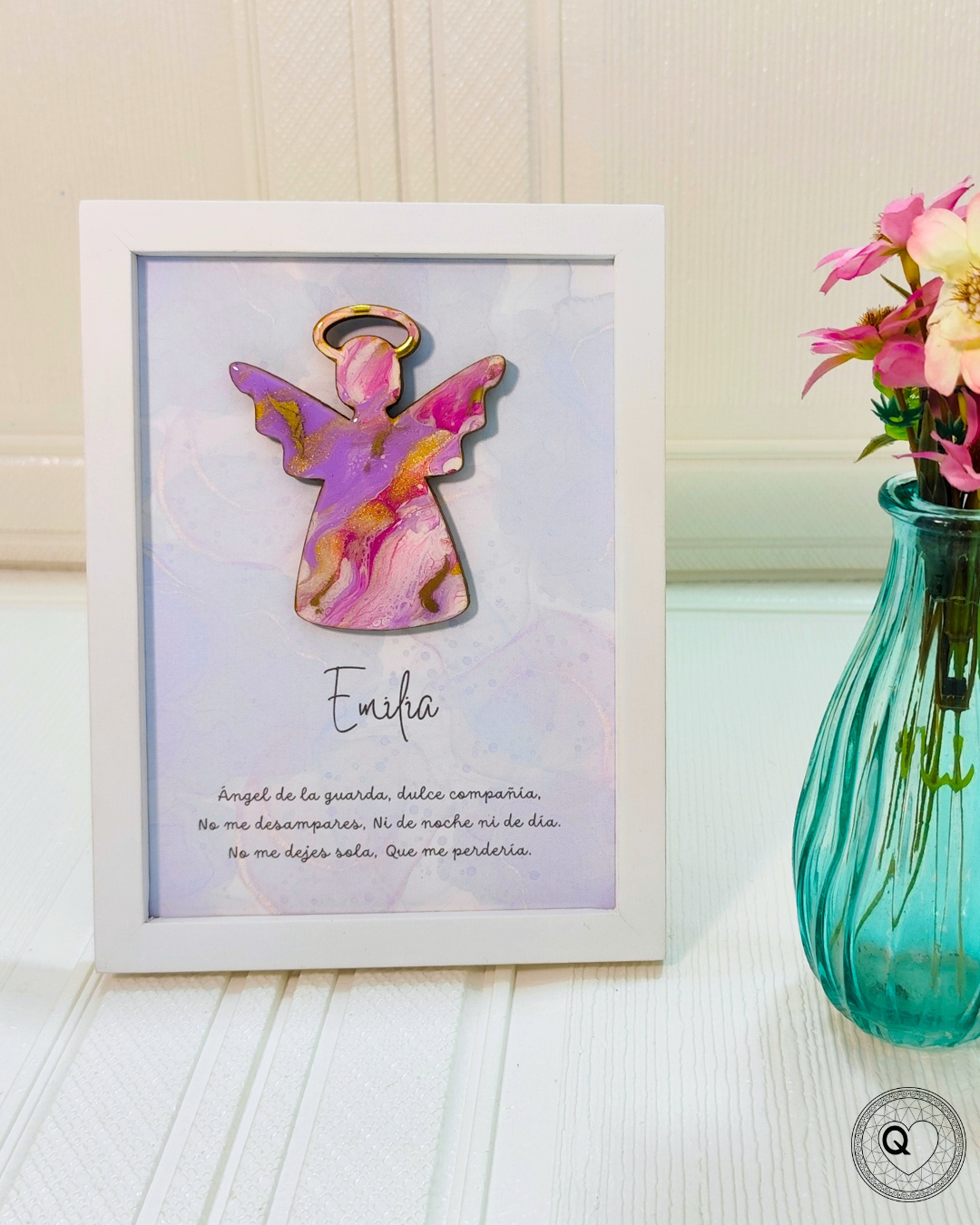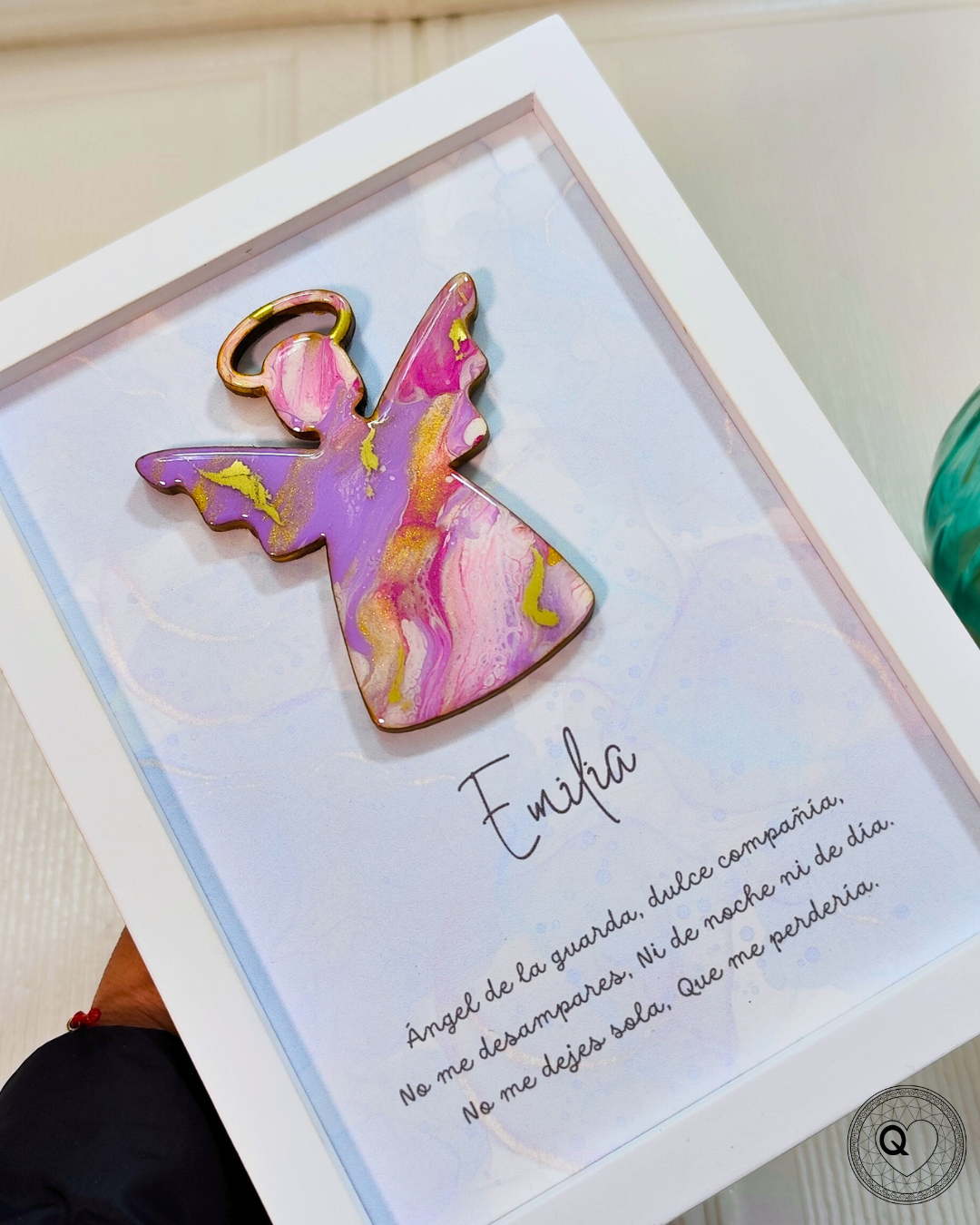 Cuadro de ángel de la guarda, único para acompañar y proteger a tu pequeño, pintado a mano con acrílicos mediante la técnica de arte fluido y recubierto con resina para darle brillo y protección. El fondo, impreso en estilo acuarela, incluye el nombre personalizado (impreso), creando una pieza exclusiva de 15 x 20 cm, ideal para decorar con amor y significado.