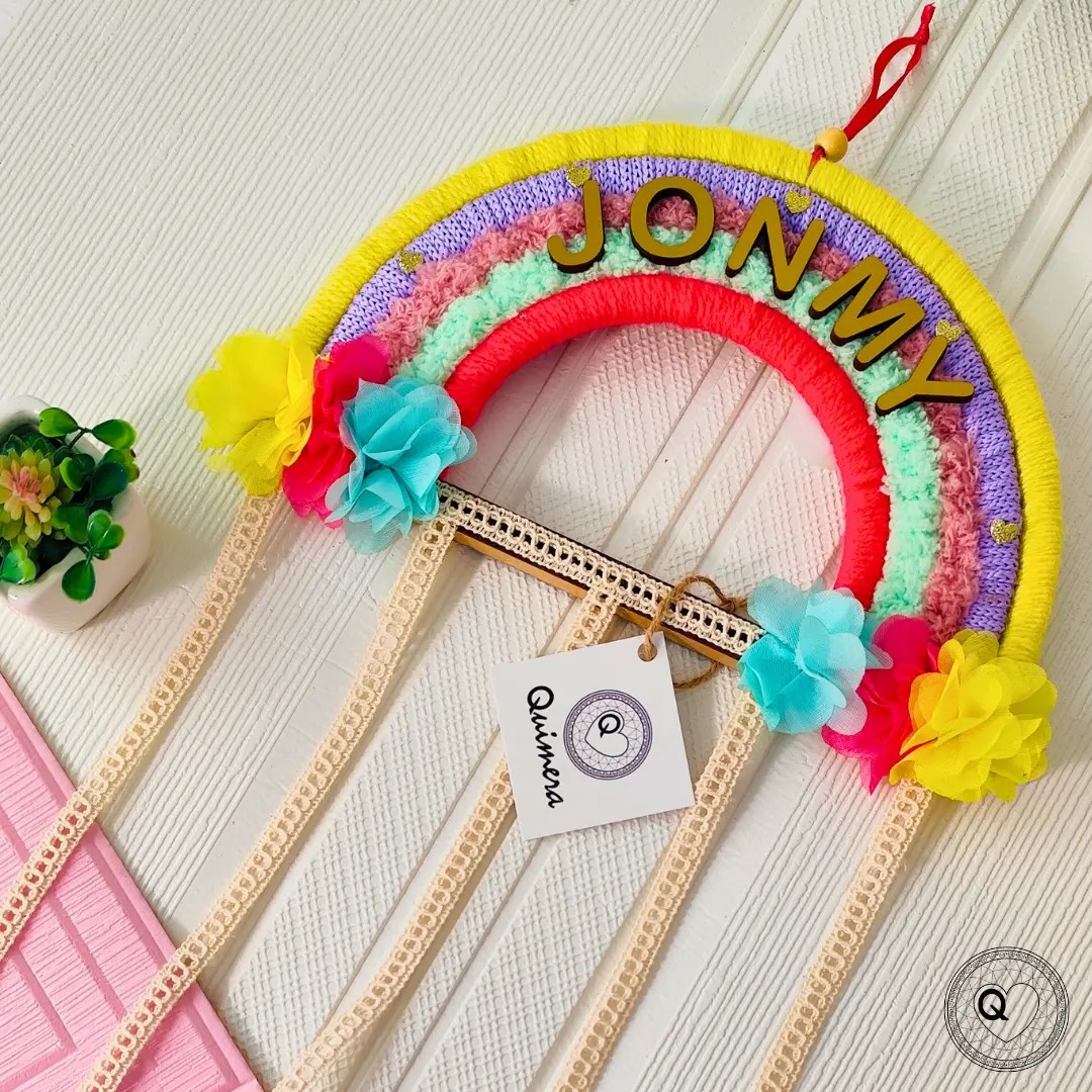 Arcoíris organizador de ganchos hecho a mano, decorativo y práctico para mantener todo en orden. Mide 25 x 70 cm, ideal para colgar en paredes o puertas. Se puede personalizar con nombre y es un regalo perfecto para cumpleaños, nacimientos o baby showers.