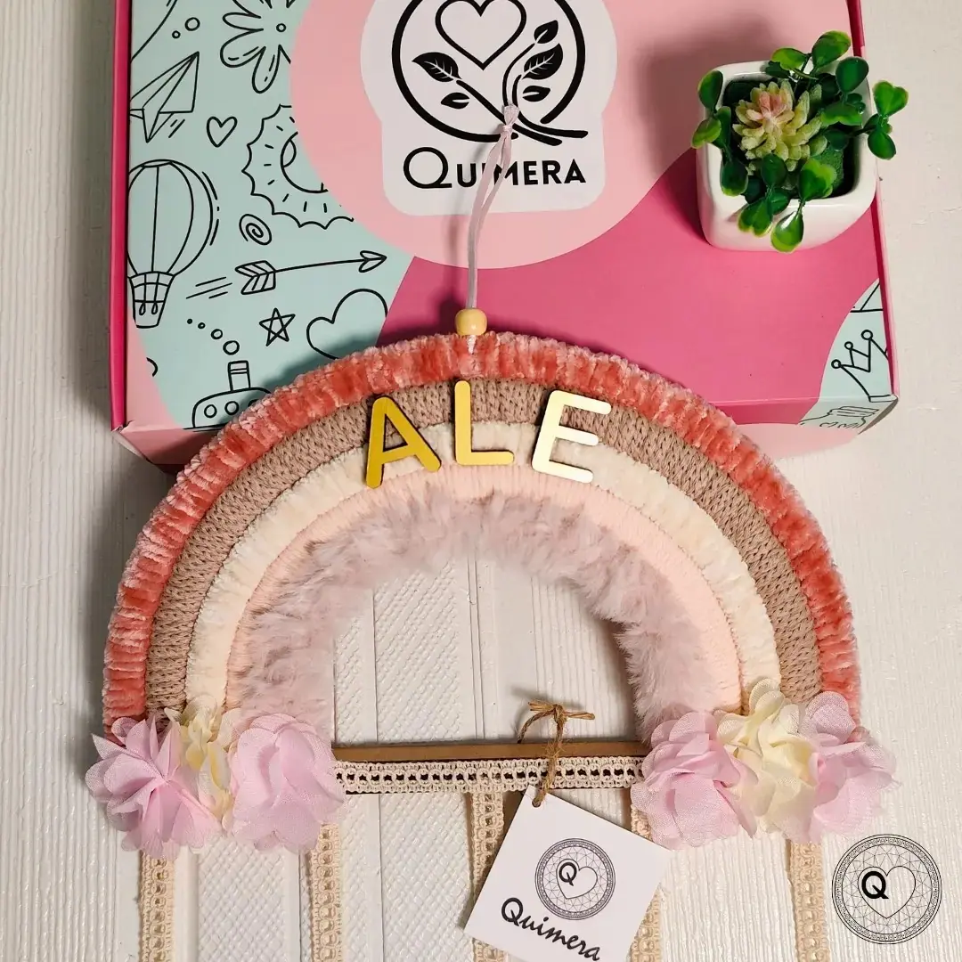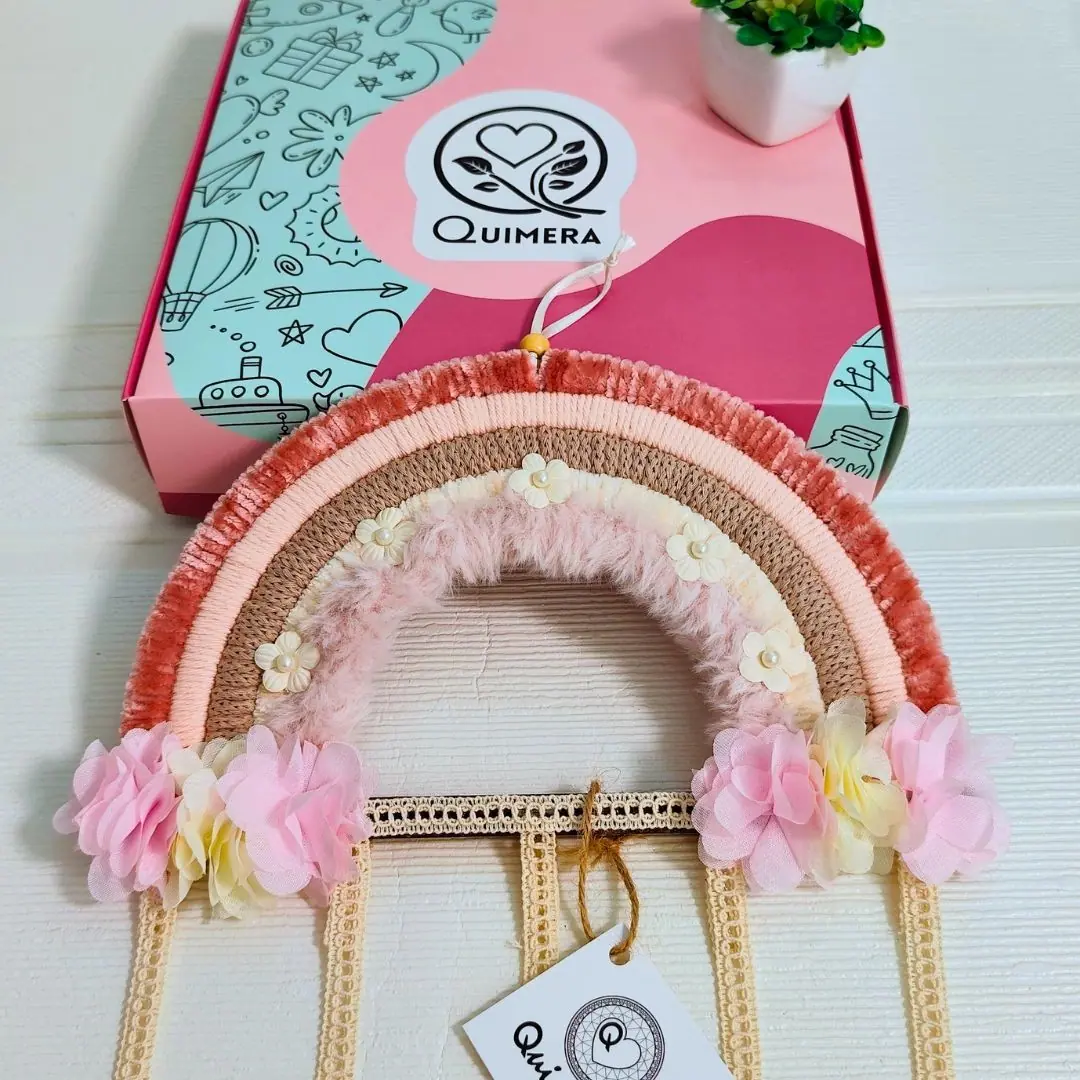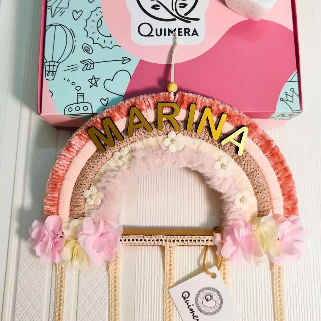Arcoíris organizador de ganchos hecho a mano, decorativo y práctico para mantener todo en orden. Mide 25 x 70 cm, ideal para colgar en paredes o puertas. Se puede personalizar con nombre y es un regalo perfecto para cumpleaños, nacimientos o baby showers.