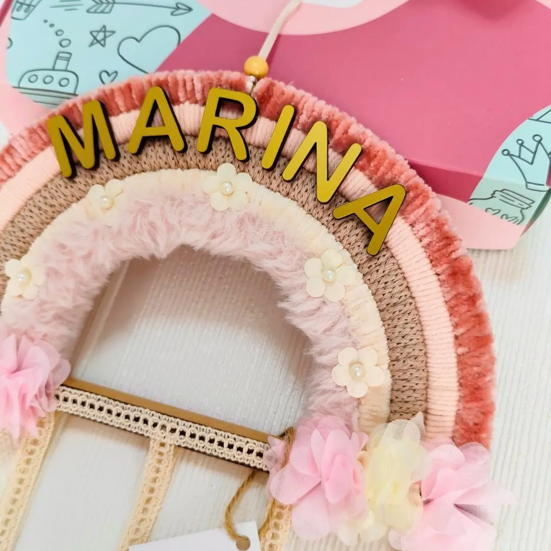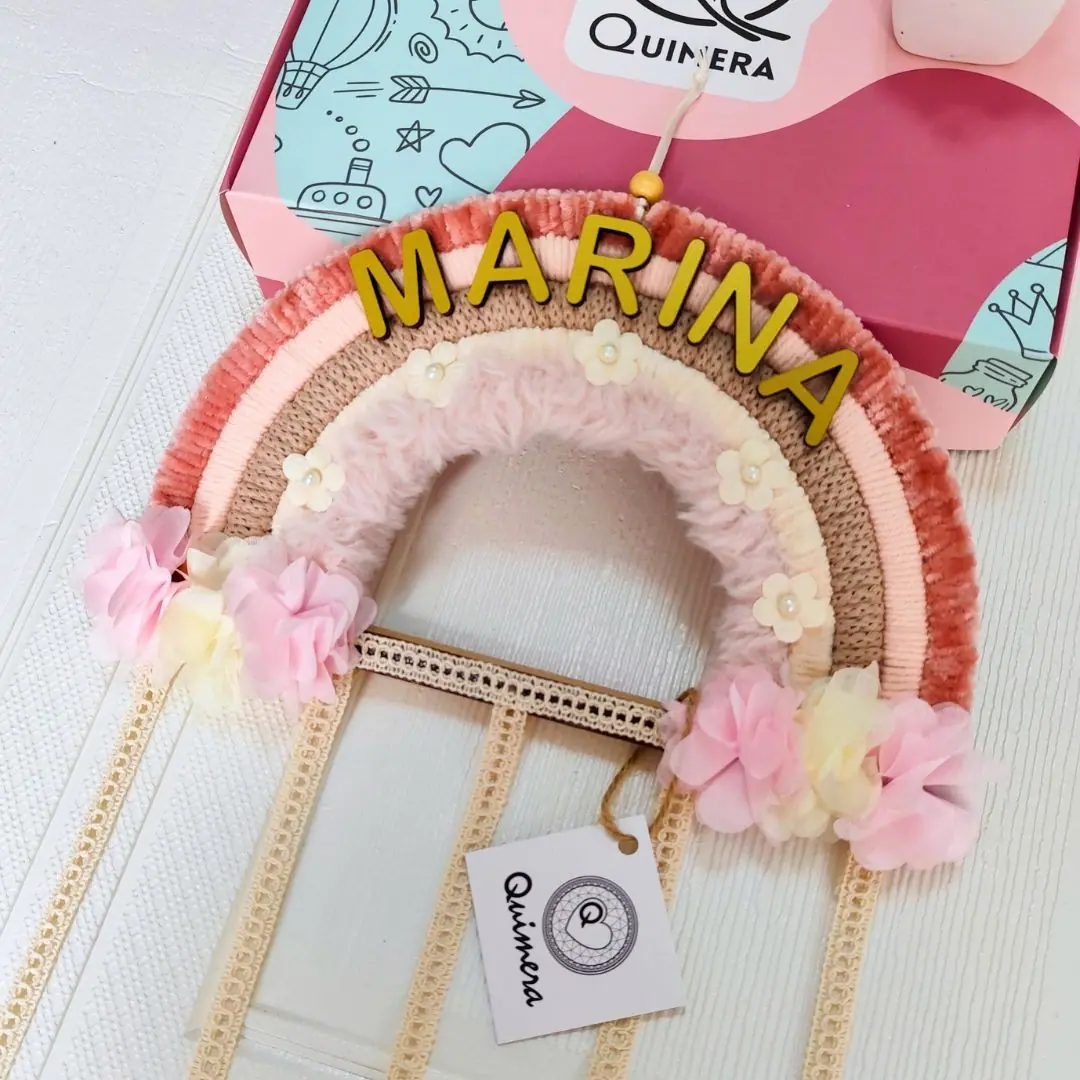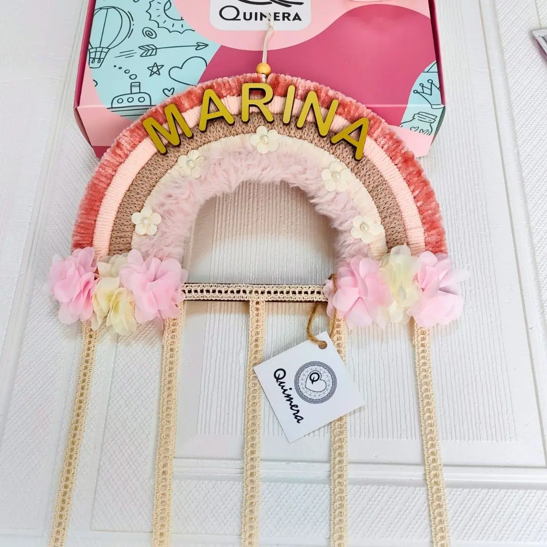 Arcoíris organizador de ganchos hecho a mano, decorativo y práctico para mantener todo en orden. Mide 25 x 70 cm, ideal para colgar en paredes o puertas. Se puede personalizar con nombre y es un regalo perfecto para cumpleaños, nacimientos o baby showers.
