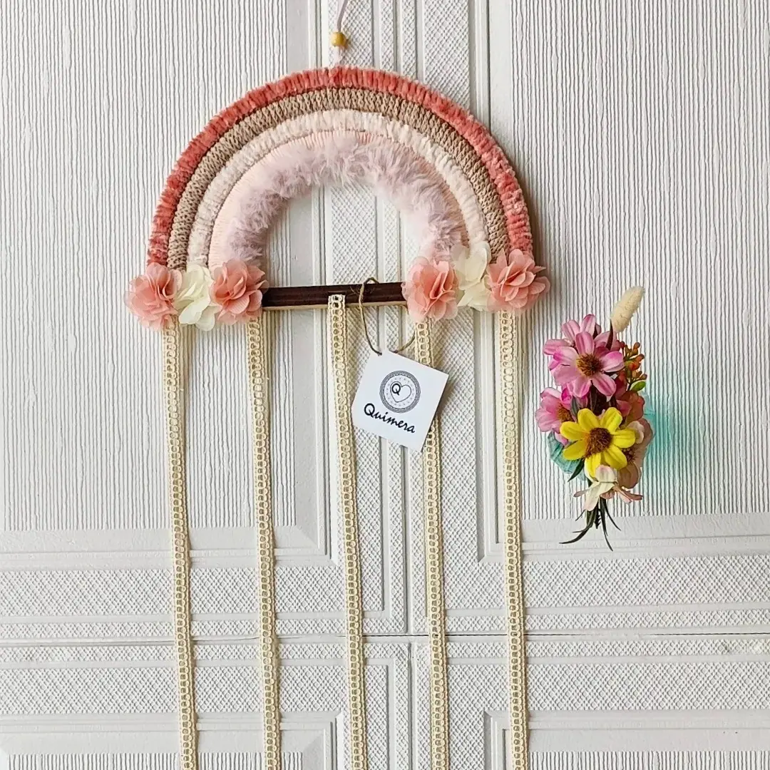 Arcoíris organizador de ganchos hecho a mano, decorativo y práctico para mantener todo en orden. Mide 25 x 70 cm, ideal para colgar en paredes o puertas. Se puede personalizar con nombre y es un regalo perfecto para cumpleaños, nacimientos o baby showers.