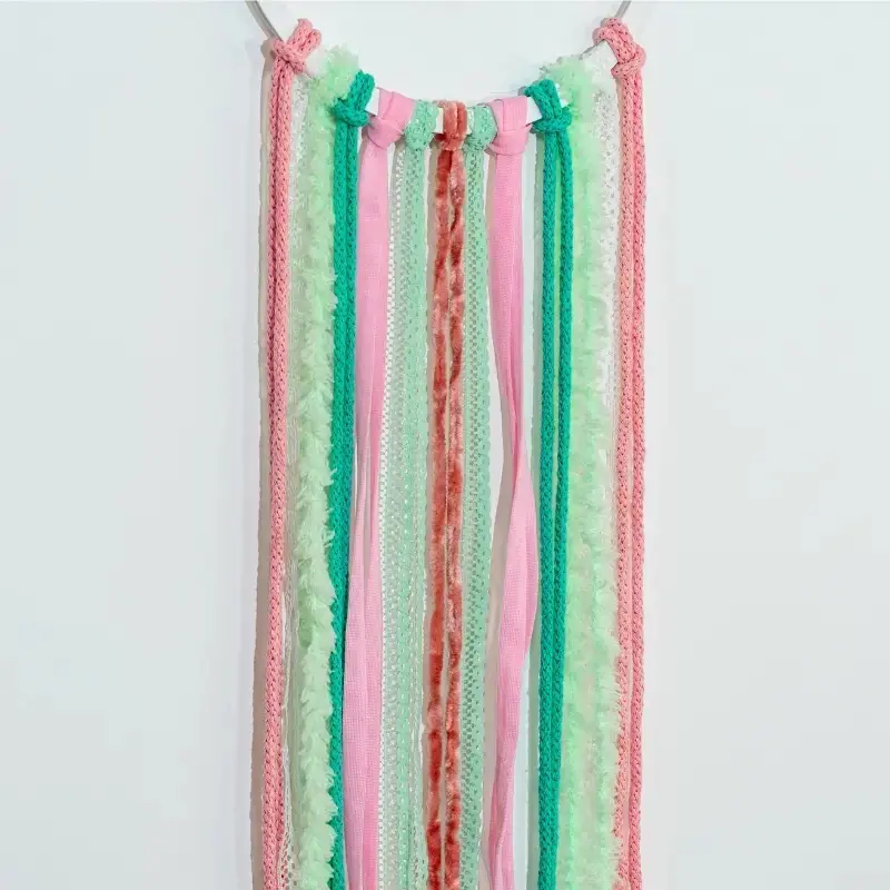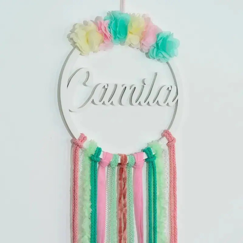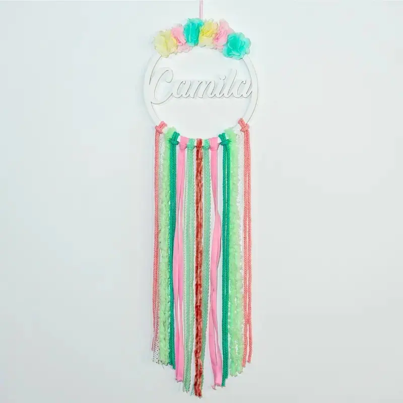 Atrapasueños personalizado con el nombre en madera, decorado con cintas de colores y flores de tela. Cada pieza es única y especial, ideal para habitaciones infantiles o como regalo en nacimientos, baby showers y cumpleaños.
