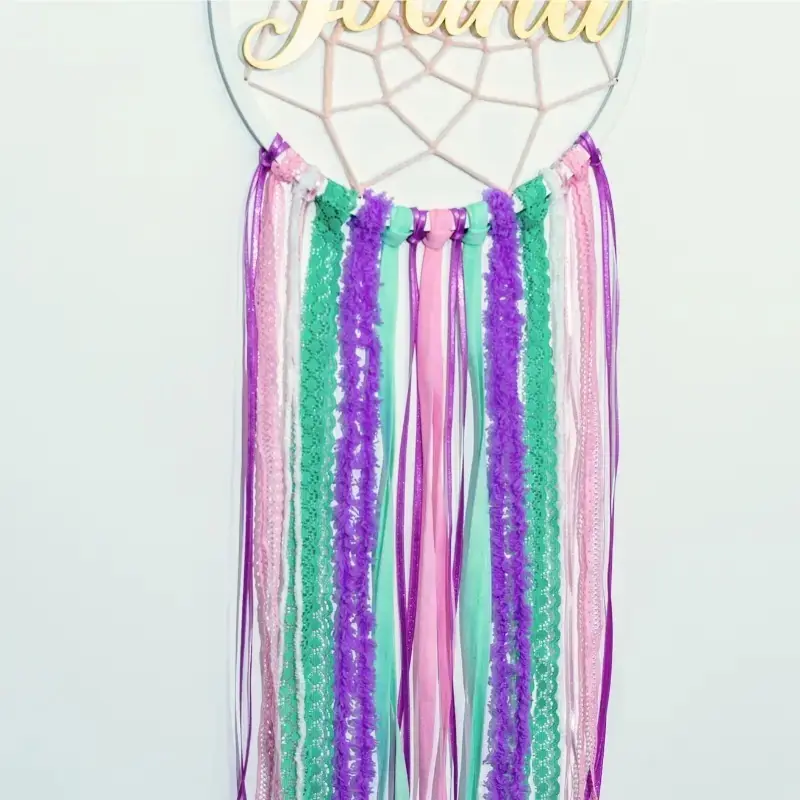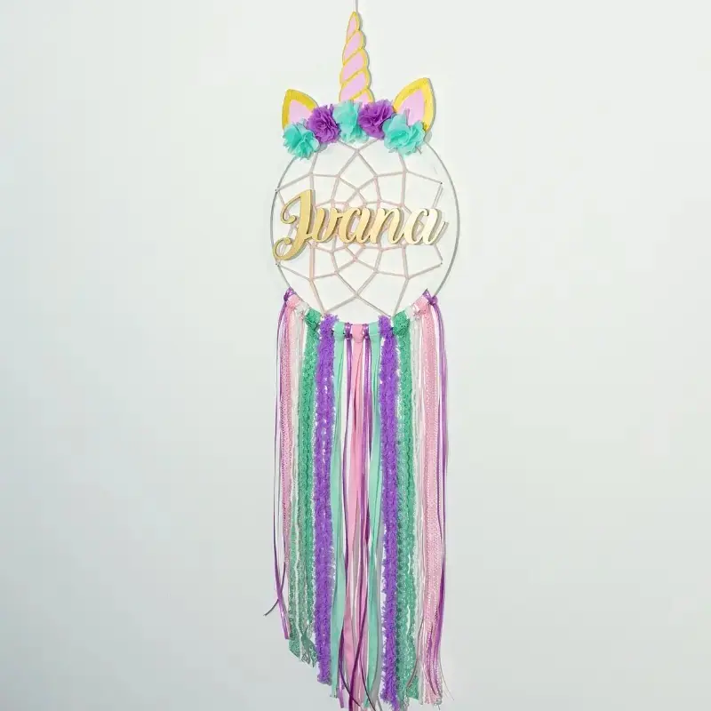 Atrapasueños con diseño de unicornio personalizado con el nombre en madera dorada. Hecho a mano con aro de 25 cm, cintas y flores decorativas, mide aprox. 80 cm de largo. Un detalle mágico y único para decorar habitaciones infantiles o regalar en ocasiones especiales.