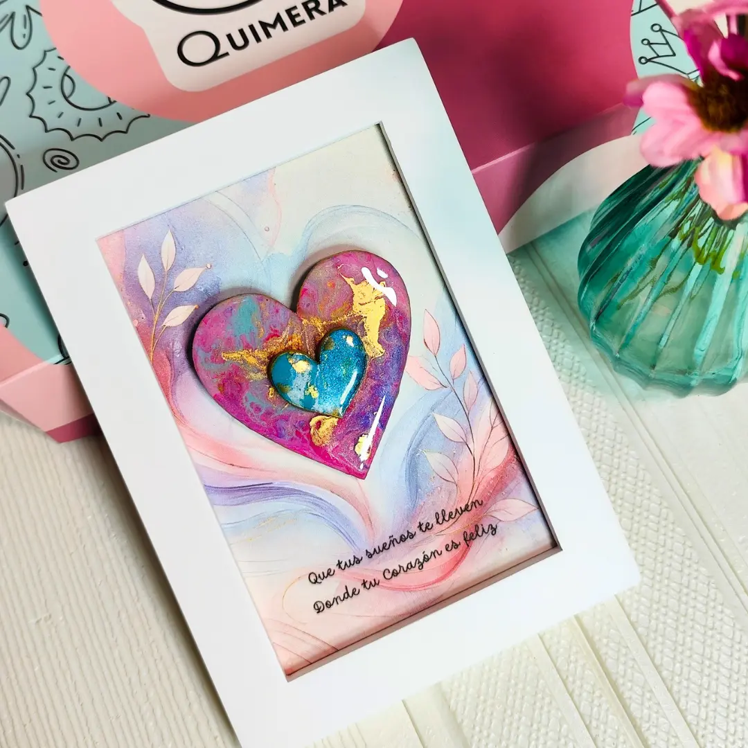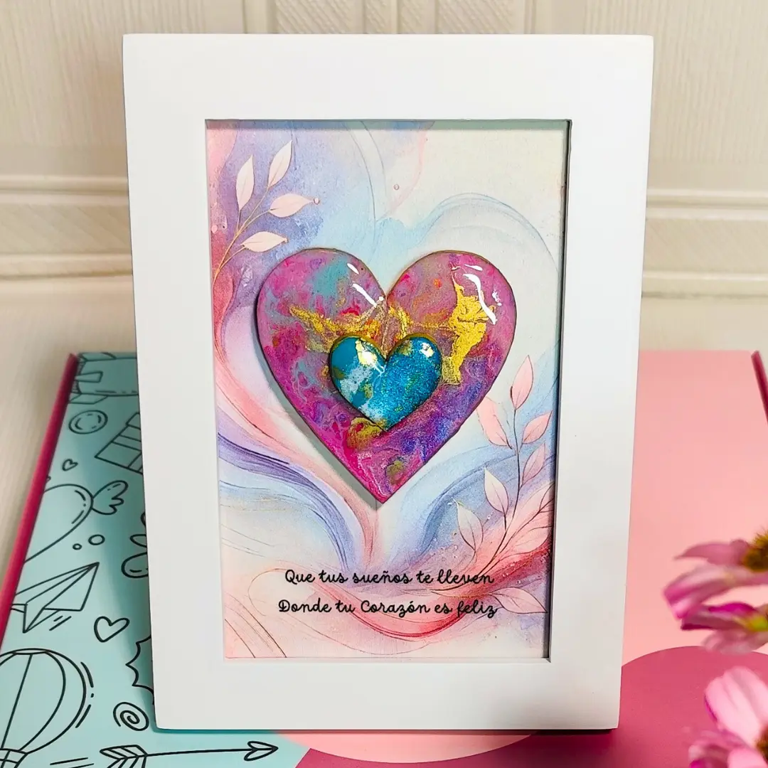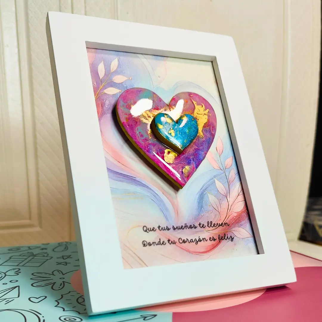 Cuadro con 2 corazones en arte fluido, recubierto en resina. Pieza única de 13 x 18 cm, con marco de madera blanca, parante y gancho para colgar. El regalo perfecto para esa persona especial.