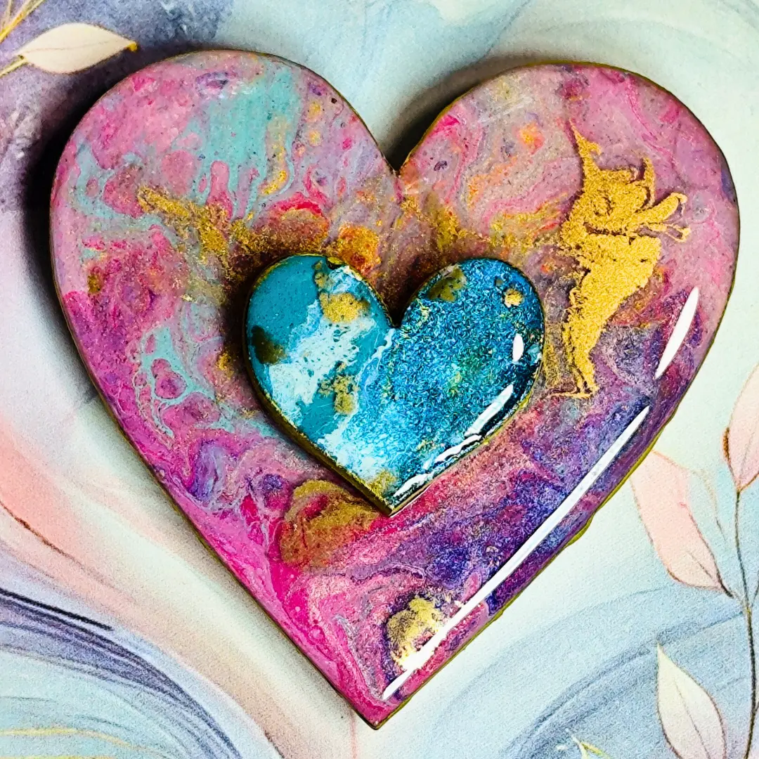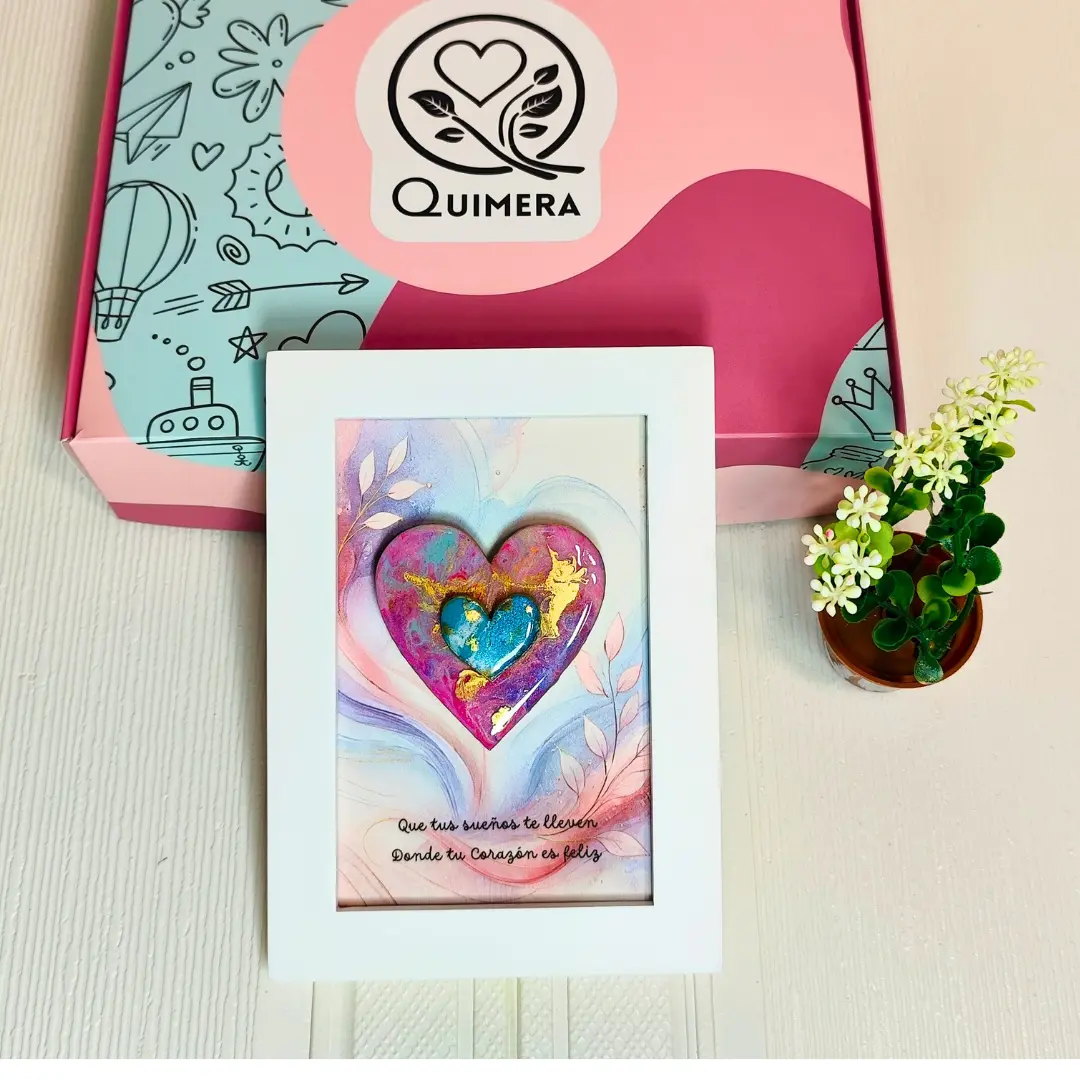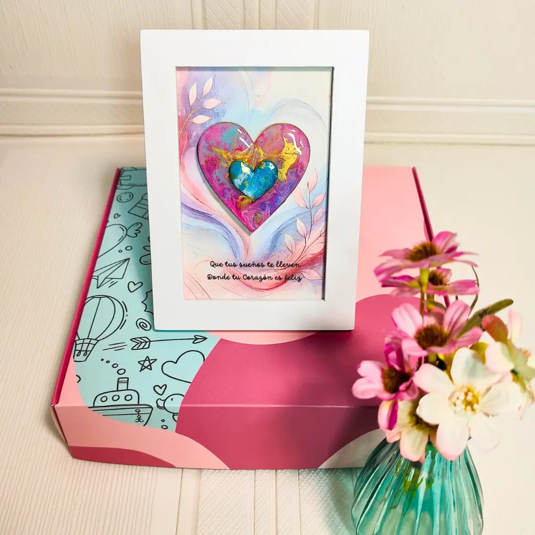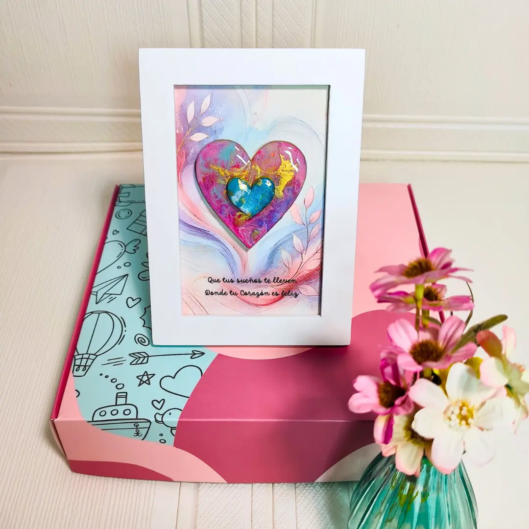 Cuadro con 2 corazones en arte fluido, recubierto en resina. Pieza única de 13 x 18 cm, con marco de madera blanca, parante y gancho para colgar. El regalo perfecto para esa persona especial.
