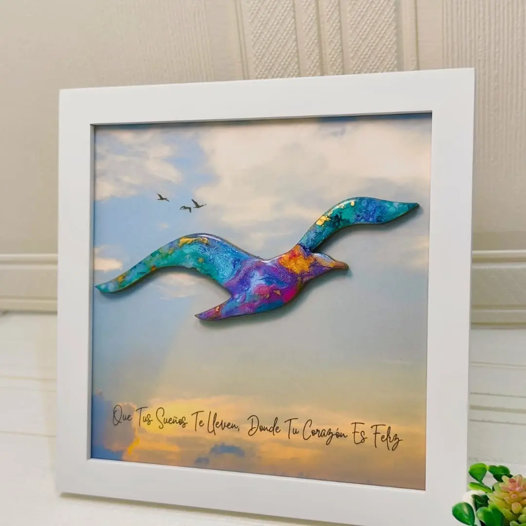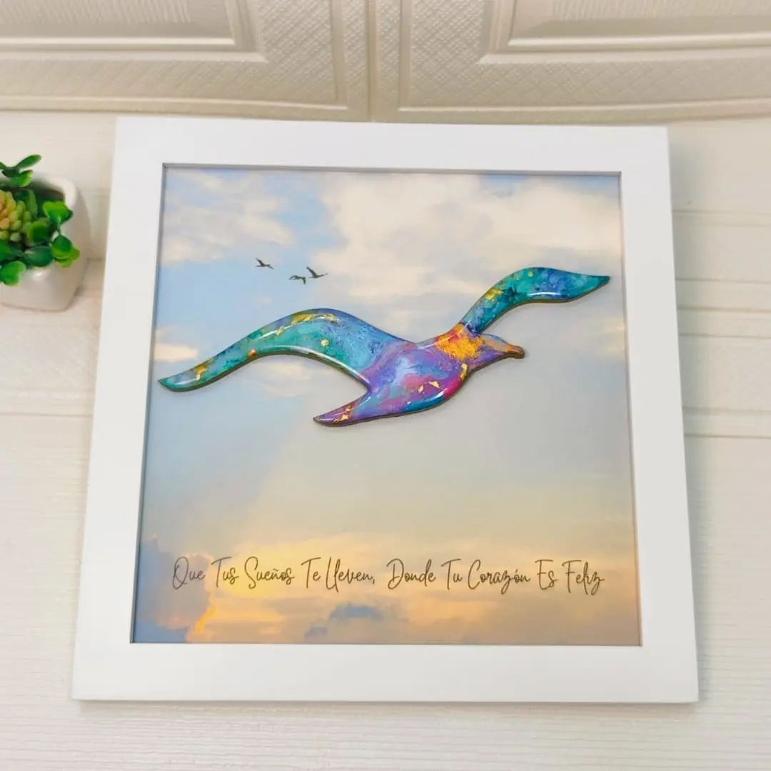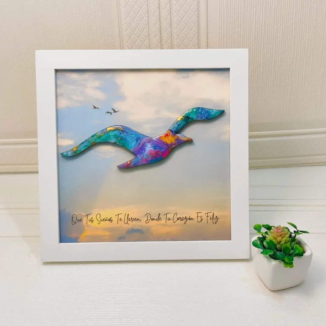 Cuadro en forma de gaviota en vuelo, pintado a mano con la técnica de arte fluido y acabado único e irrepetible. De 23 x 23 cm sin vidrio, puede personalizarse con la frase que elijas, siendo una pieza exclusiva y perfecta para decorar cualquier espacio con libertad y armonía.