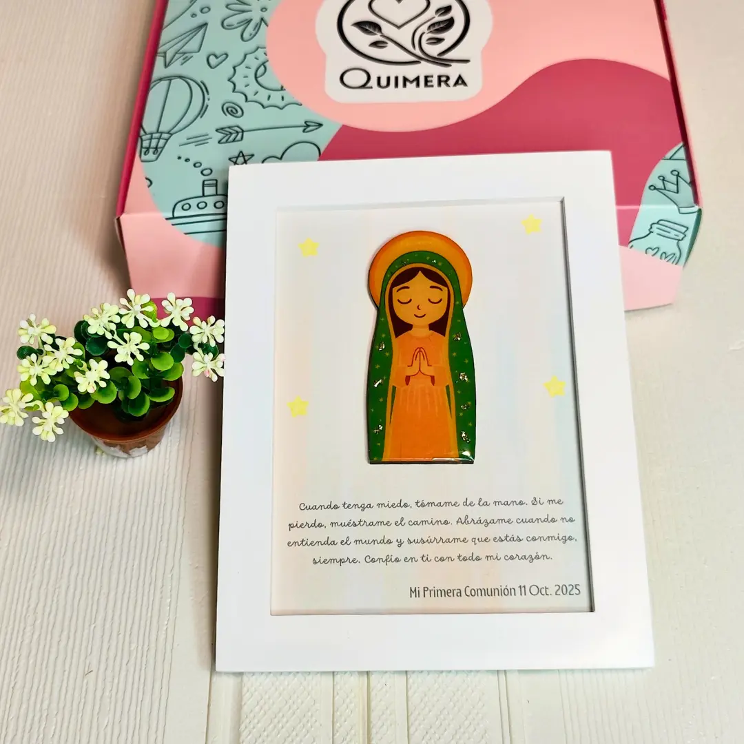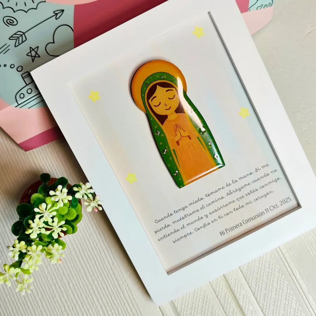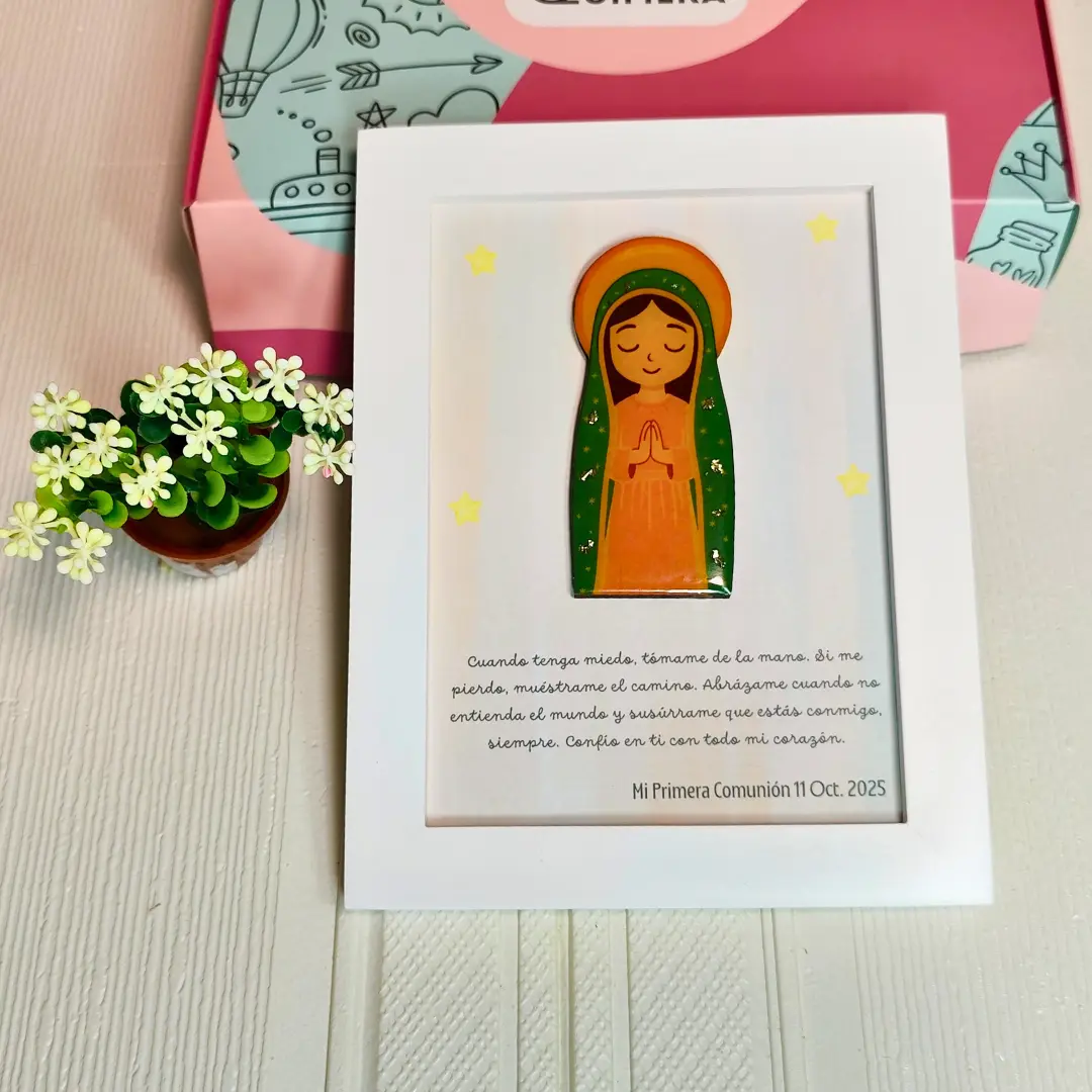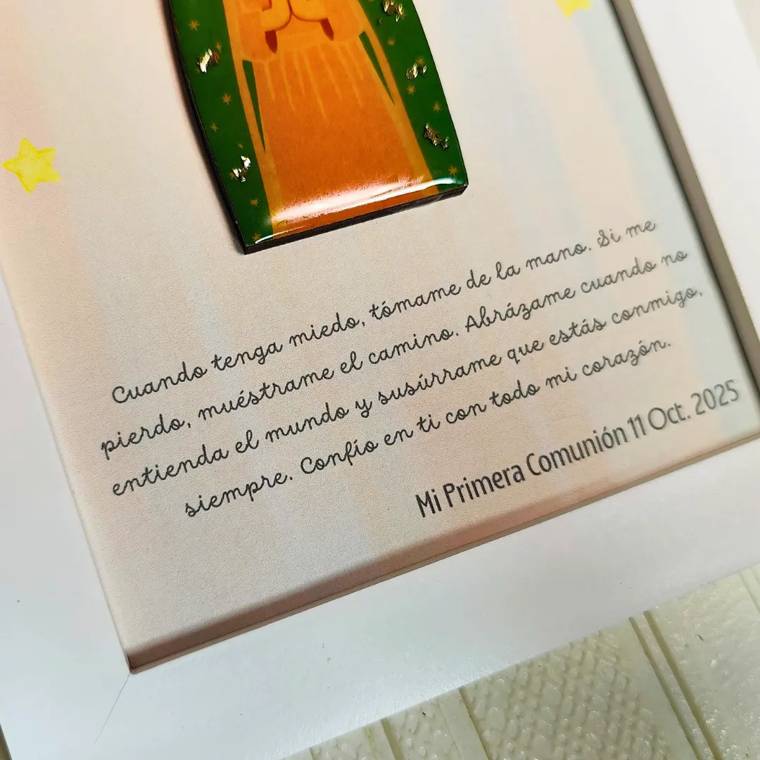 Nuestro cuadro de la Virgen de Guadalupe en ilustración digital, con resina protectora y detalles en pan de oro, incluye oración, y fecha personalizada. Tamaño: 16 x 21 cm. Regalo unico de primera comunión. listo para regalar.